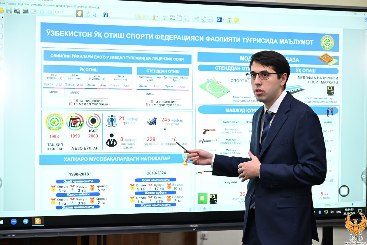 Shundan soʻng Oʻzbekiston oʻq otish federatsiyasining Los-Anjeles-2028 yozgi Olimpiya oʻyinlariga tayyorgarlik rejasi koʻrib chiqildi. Unda sportchilarimizni litsenzion musobaqalarga tayyorlash, terma jamoa moddiy texnik-bazasini yanada yaxshilash borasida tavsiyalar ilgari surilib, bu borada amalga oshirilishi lozim boʻlgan ishlar belgilab olindi.