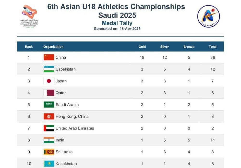Saudiya Arabistonining Dammam shahrida yengil atletika boʻyicha U18 yosh toifasidagi Osiyo chempionati oʻz yakuniga yetdi. Unda qatnashgan Oʻzbekiston terma jamoasi 3 ta oltin, 5 ta kumush va 4 ta bronza medallari bilan umumjamoa hisobida ikkinchi oʻrinni egalladi. Bu bilan yoshlarimiz ilk bor qit’a chempionatida ikkinchi natijani qayd etishdi.