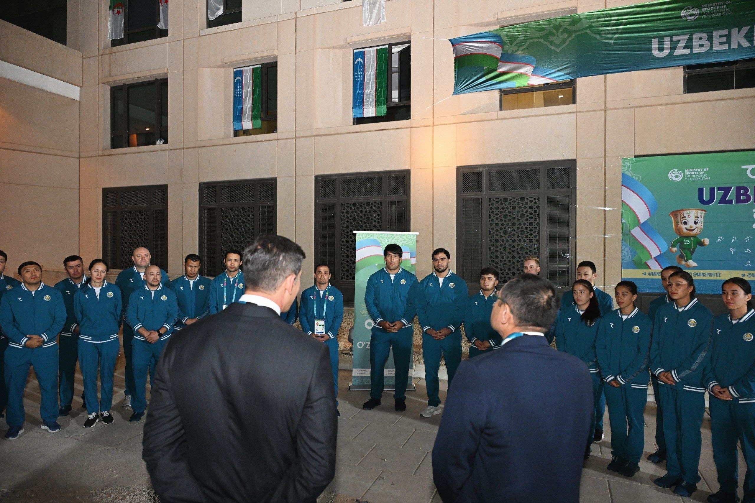 Uchrashuv davomida mutasaddilar musobaqaning dastlabki kunida qoʻlga kiritilgan medallar bilan sportchilarimizni tabriklab, ularga kelgusi bellashuvlarda ham muvaffaqiyat va gʻalabalar tiladi. Shu tariqa, Oʻzbekiston jamoasi a’zolarining ruhiy tayyorgarligi va jipsligini yanada mustahkamlovchi iliq uchrashuv boʻlib oʻtdi.