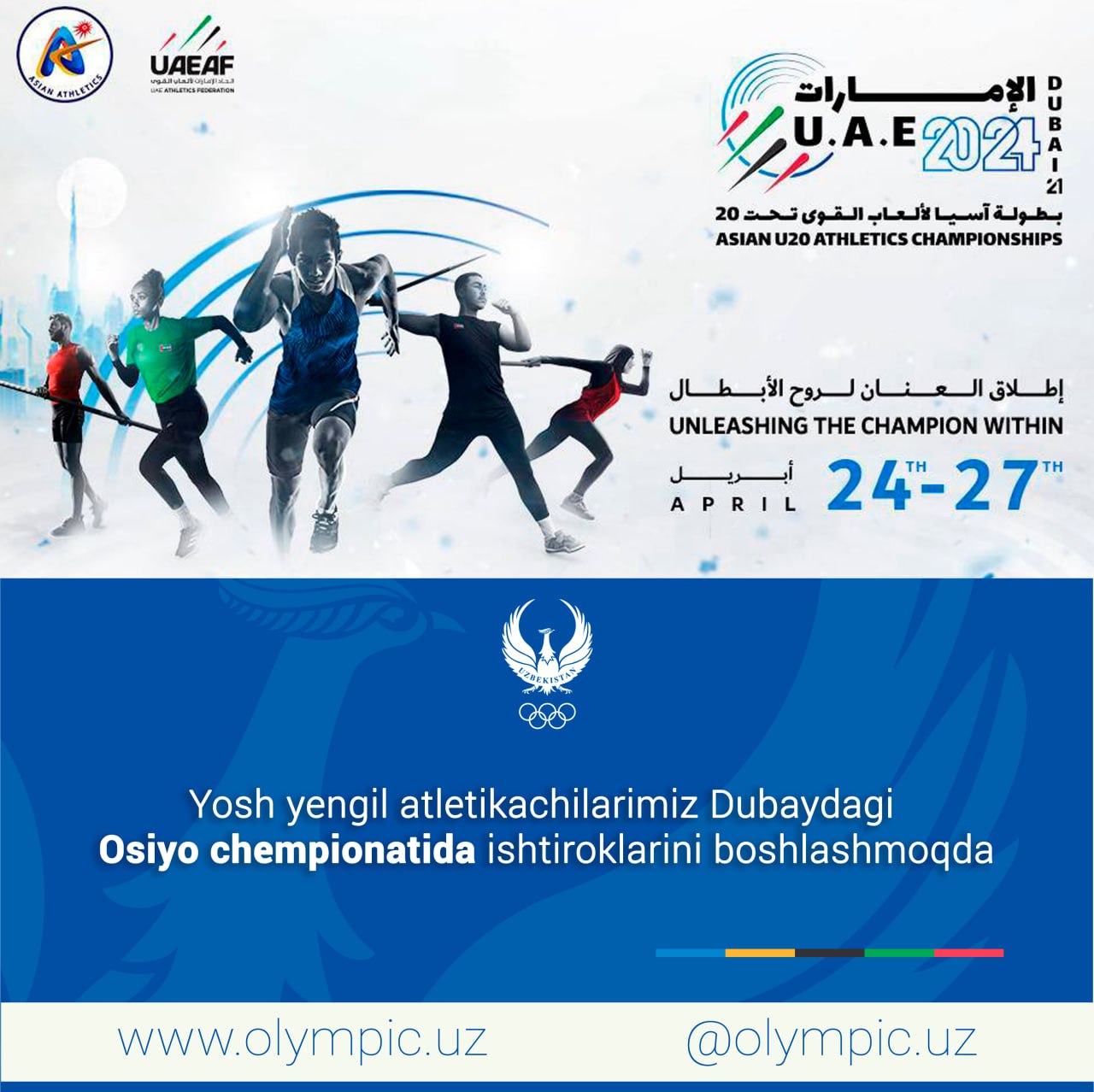 Bugun BAAning Dubay shahrida yengil atletika boʻyicha U20 yosh toifasidagi Osiyo chempionati boshlan...