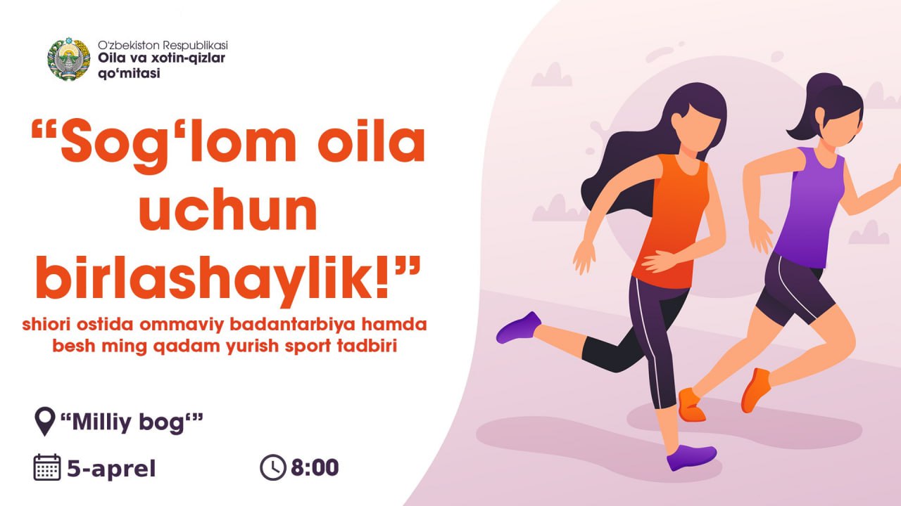 Joriy yilning 5-aprel kuni soat 8:00 da “Milliy bog‘”da xotin-qizlar bilan “Sog‘lom oila uchun birla...