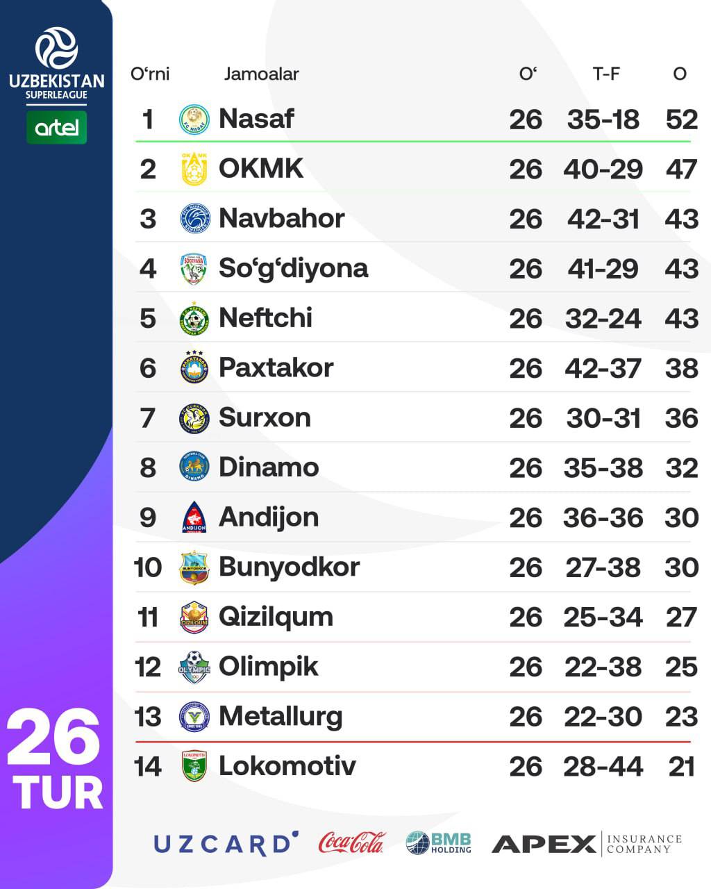 Futbol boʻyicha Oʻzbekiston Superligasining joriy mavsumi nihoyasiga yetdi. Unda “Nasaf” jamoasi olt...