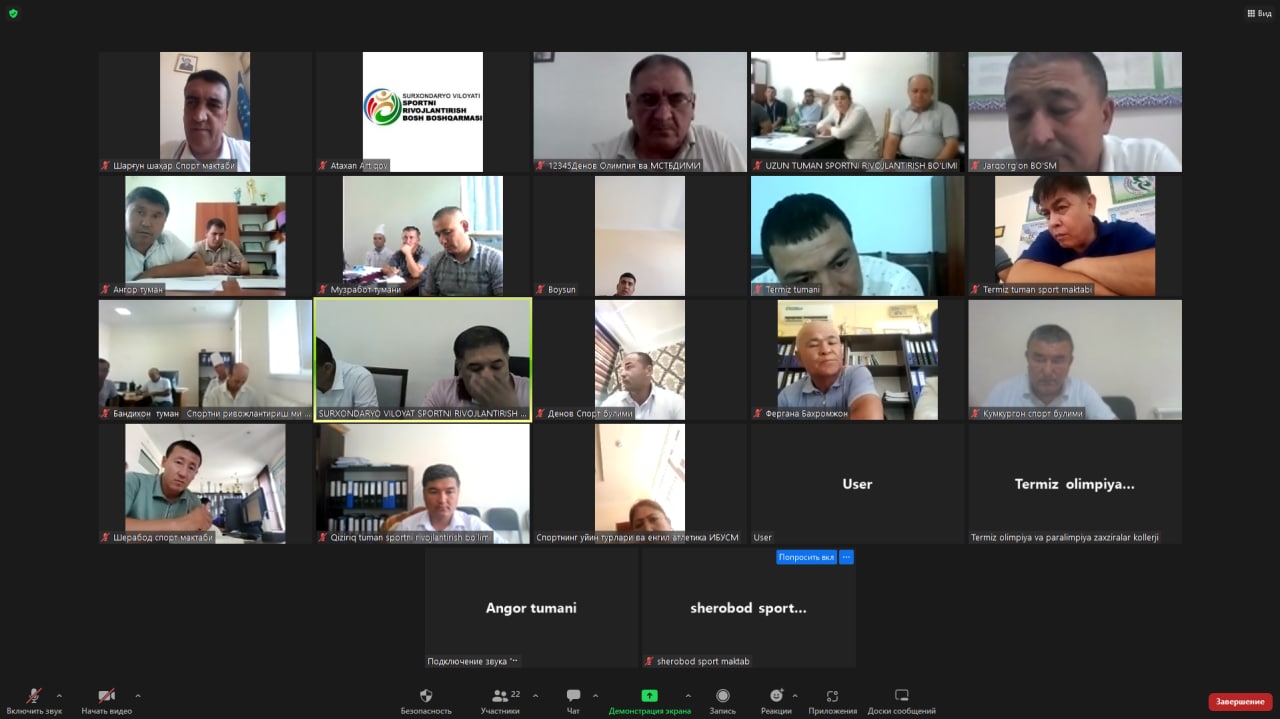 В завершение визита в Сурхандарьинскую область было проведено онлайн-совещание с участием руководителей всех спортивных образовательных учреждений области через платформу ZOOM. В ходе мероприятия были проведены необходимые разъяснительные работы и даны рекомендации ответственным руководителям.