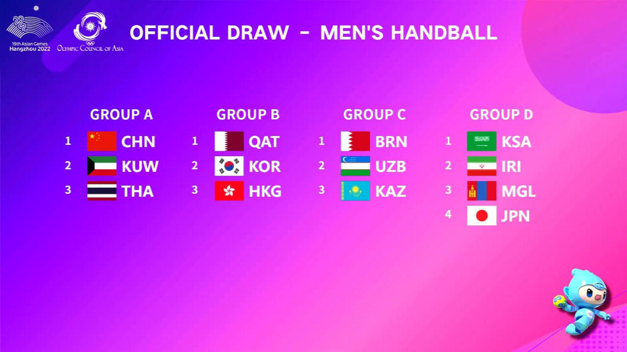 Сегодня проходит жеребьёвка групповых соревнований по командным видам спорта из программы Азиатских игр Ханчжоу-2022. К настоящему времени определились соперники мужской и женской сборных Узбекистана по гандболу, которые примут участие в турнире. Все группы: