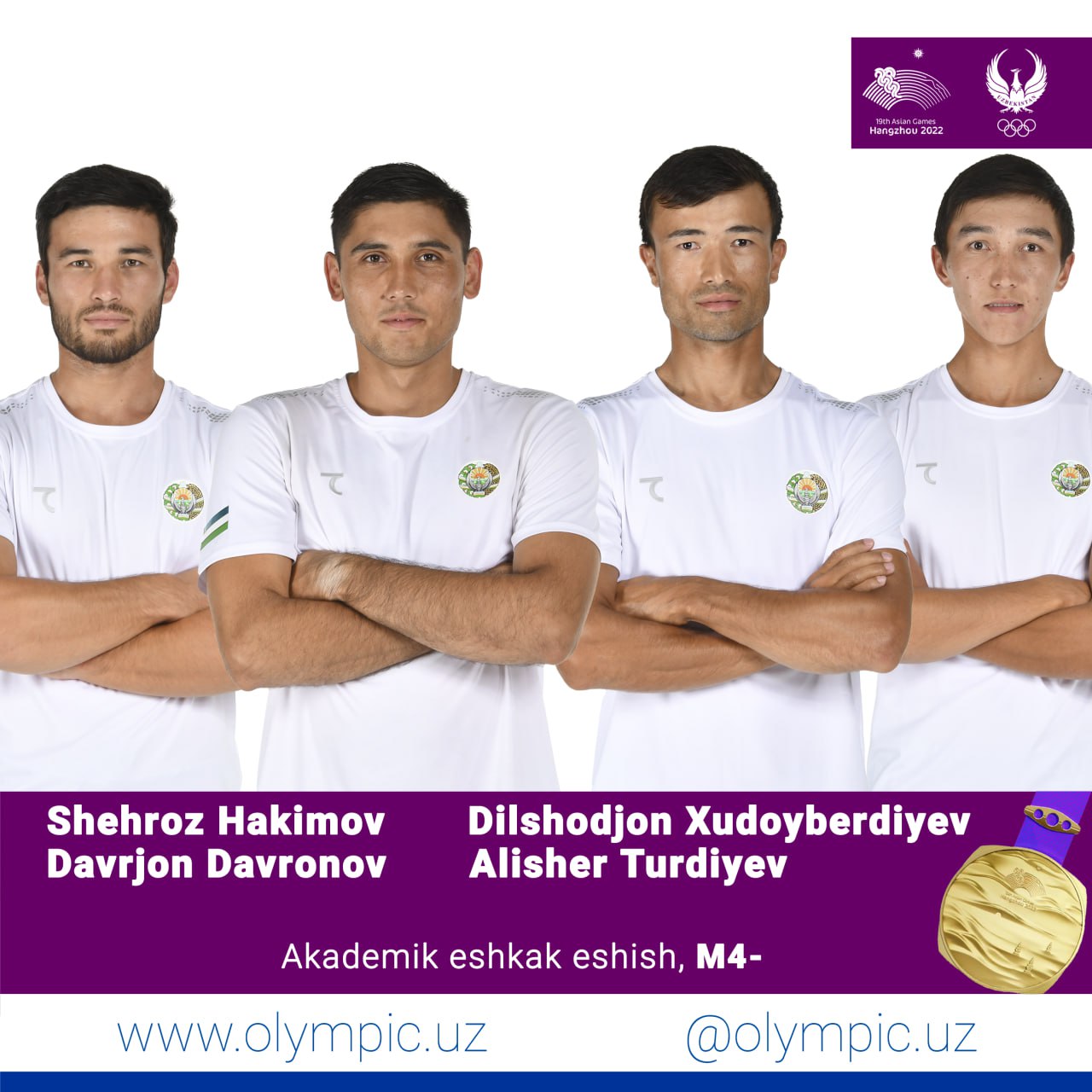 Узбекские академические гребцы завоевали очередную золотую медаль. На этот раз квартет Шехроза Хакимова, Давржона Давронова, Дилшоджона Худойбердиева и Алишера Турдиева, участвовавший в программе М4- среди мужчин, первым пересёк финишную черту и завоевал третью золотую медаль в копилку делегации Узбекистана. Браво, ребята!