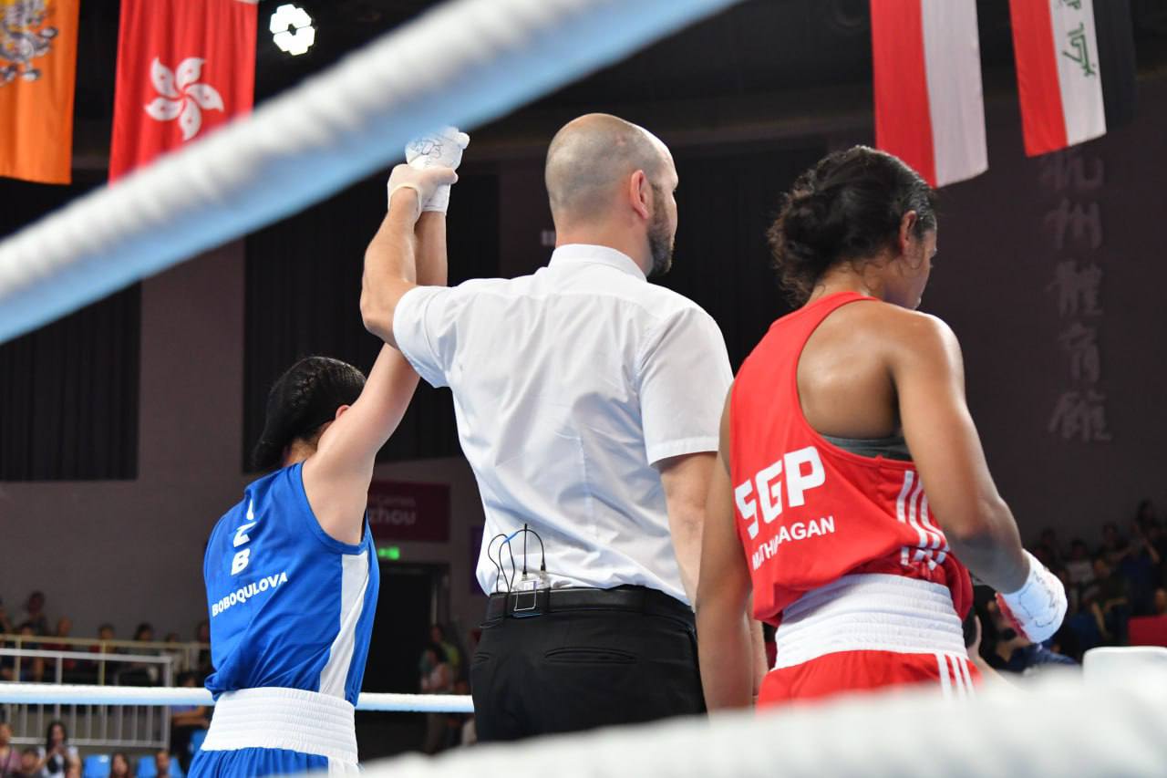 Представительница сборной Узбекистана по боксу Сабина Бобокулова (-50 кг) вышла в следующий этап состязаний. В поединке против До Даниши из Сингапура наша соотечественница оформила победу со счётом 5:0.