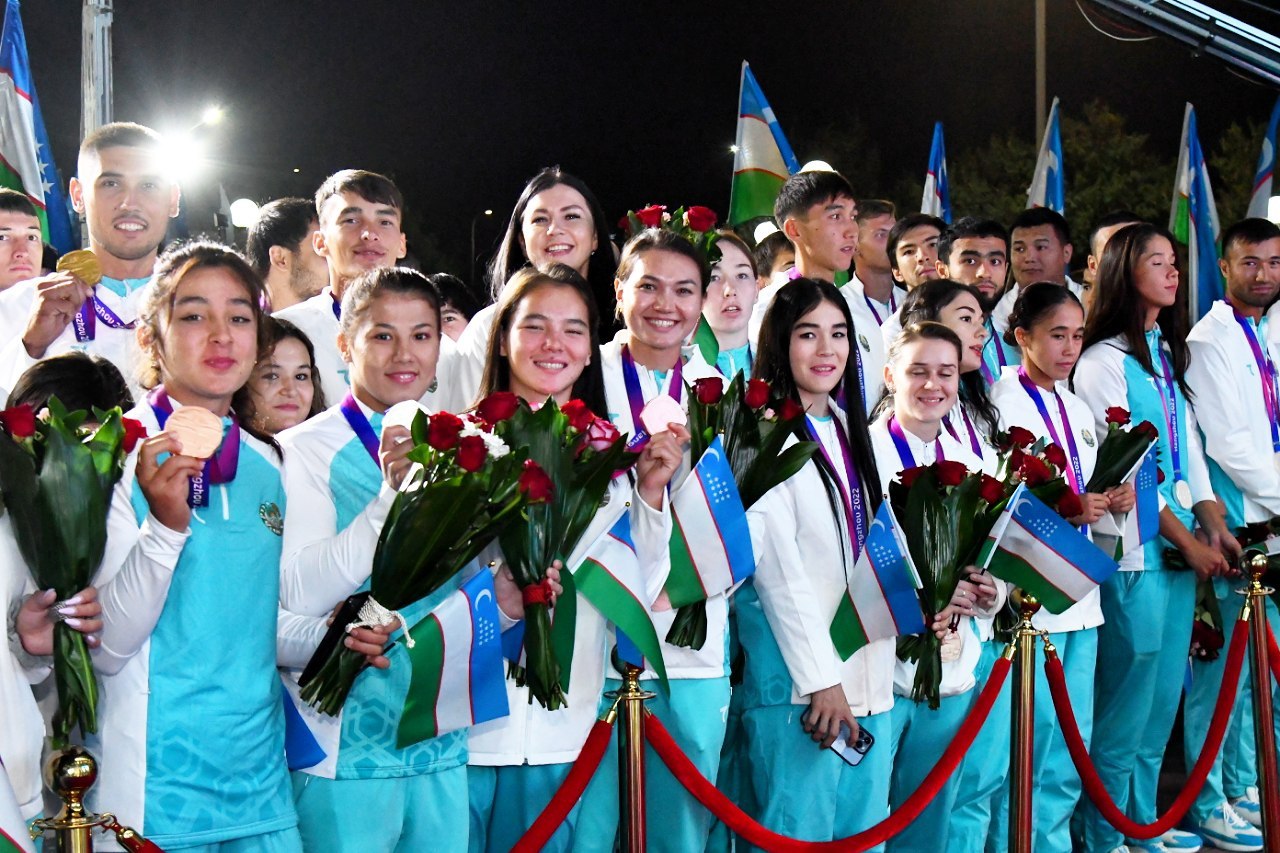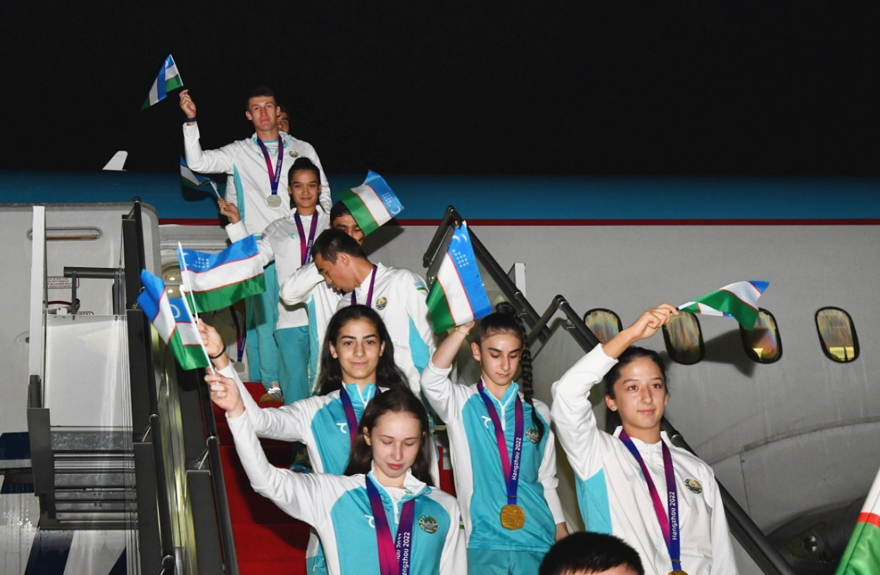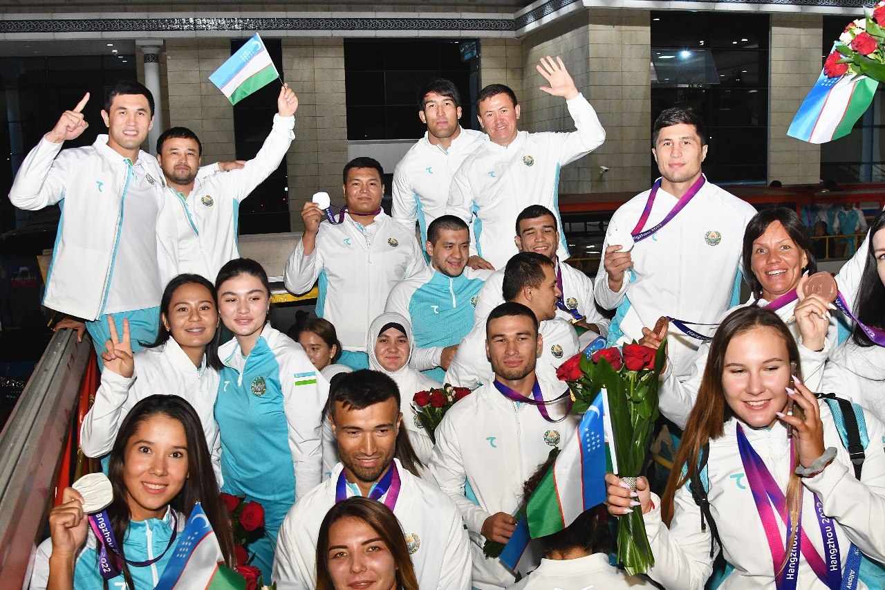 Делегация Узбекистана, успешно принявшая участие в XIX летних Азиатских играх, состоявшихся в китайском городе Ханчжоу с 23 сентября по 8 октября, была встречена торжественно. Наши соотечественники прибыли на Родину на специальном чартерном рейсе, организованном со стороны государства.