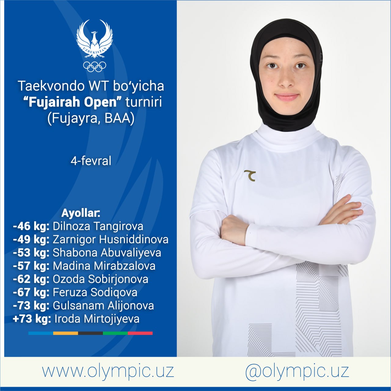 4 февраля в городе Фуджайра (ОАЭ) состоится турнир из серии G2 по таэквондо. Ассоциация таэквондо WT Узбекистана объявила список представителей сборной, которые поднимутся на даян в этом соревновании.