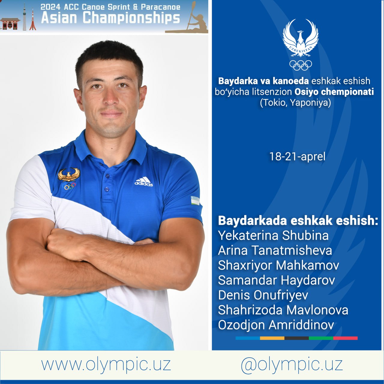 18-21 апреля в столице Японии Токио состоится чемпионат Азии по гребле на байдарках и каноэ. Примечательно, что в заплыве на Олимпийские дистанции, будут разыграны и путёвки на Париж-2024. Согласно сведениям федерации Rowing&Canoe Узбекистана, следующие наши атлеты выступят на лицензионном чемпионате Азии: