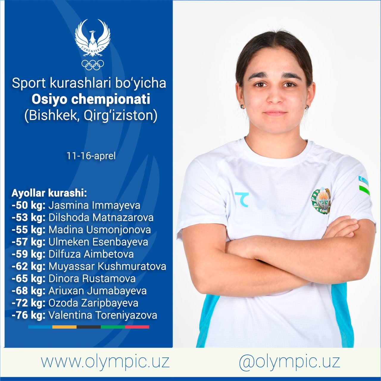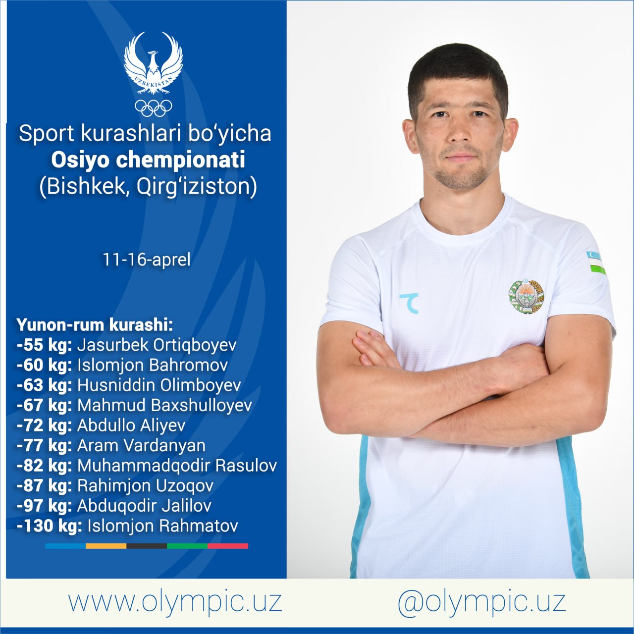11-16 апреля в Кыргызстане состоится чемпионат Азии по спортивной борьбе. Ассоциация спортивной борьбы Узбекистана официально объявила имена борцов, которые выступят в этом турнире. Согласно сведениям, следующие атлеты поднимутся на ковёр и будут бороться за призовые места: