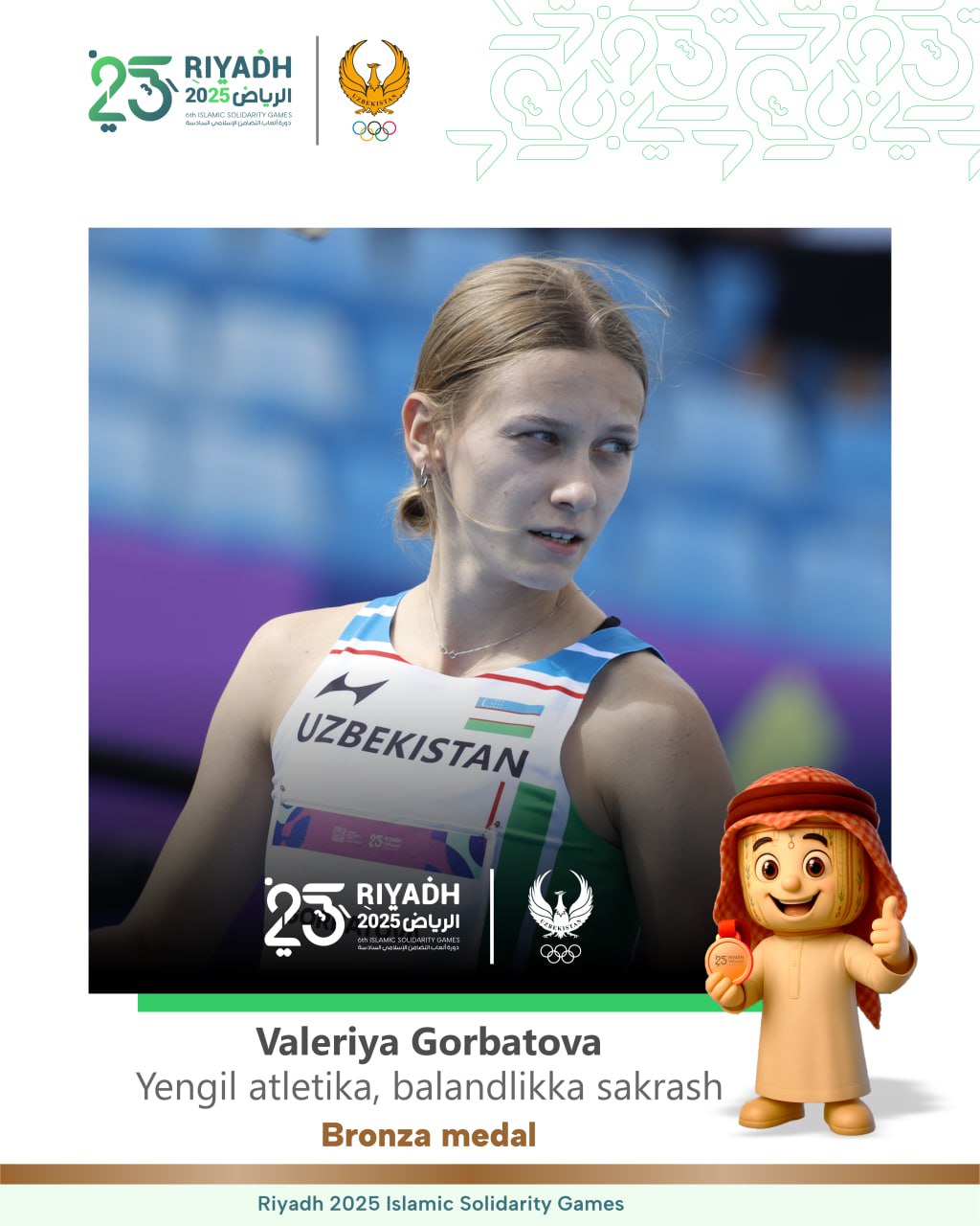 Сегодня легкоатлеты начали своё выступление и сразу же пополнили копилку нашей делегации. В соревнованиях по прыжкам в высоту Барнохон Сайфуллаева взяла высоту 1,84 м и стала обладательницей золотой медали, а Валерия Горбатова с результатом 1,81 м выиграла бронзу.