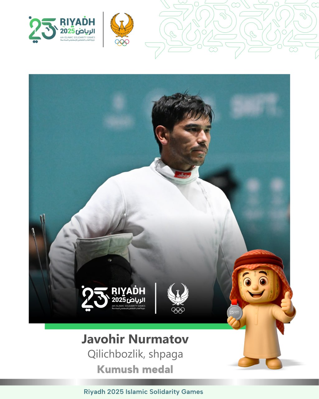Соревнования по фехтованию на шпагах среди мужчин стали удачными для двух наших спортсменов. В «узбекском финале», где за золото боролись Мейирхан Тимуров и Жавохир Нурматов, победу одержал Тимуров, тем самым завоевав 20-ю золотую медаль для нашей делегации.