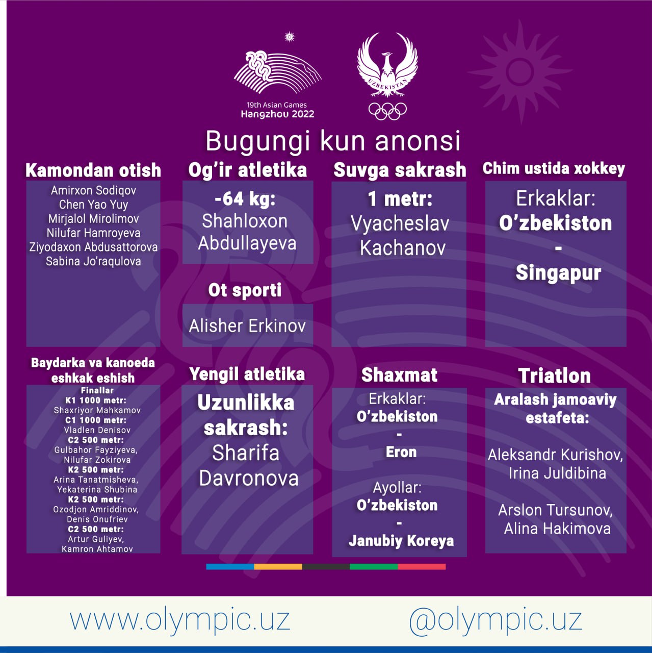 Сегодня на XIX летних Азиатских играх Ханчжоу-2022 ожидаются интересные соревнования по некоторым в ...