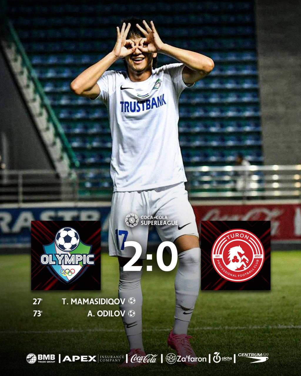 Суперлига Coca-Cola Узбекистана | 18 тур Олимпик 2:0 Турон Голы: Темур Мамасидиков, 27 (1:0), Али...