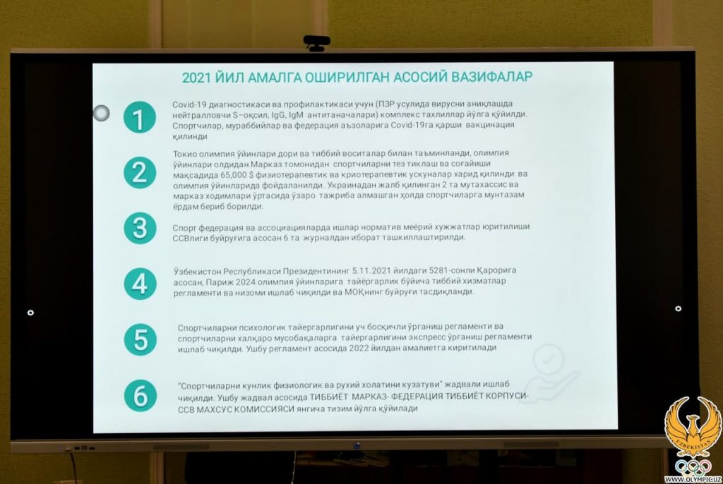 Шундан сўнг Абдушукур Садиков ўтган Олимпия ўйинлари циклида марказ фаолияти бўйича ҳисоботни ўқиб эшиттирди ва янги режалар ҳақида ўртоқлашди. Унга кўра, келгуси йил 1 январь кунидан бошлаб марказда ҳар куни 24 соат ишлайдиган “call-centre” фаолияти йўлга қўйилади. 1193 рақами билан боғланиладиган ушбу марказ нафақат терма жамоаларимиз, балки фуқароларимиз учун ҳам хизмат қилиб, ўз таркибида умумий йўналиш, психолог ва бошқа тор доирадаги мутахассисларни жамлайди.