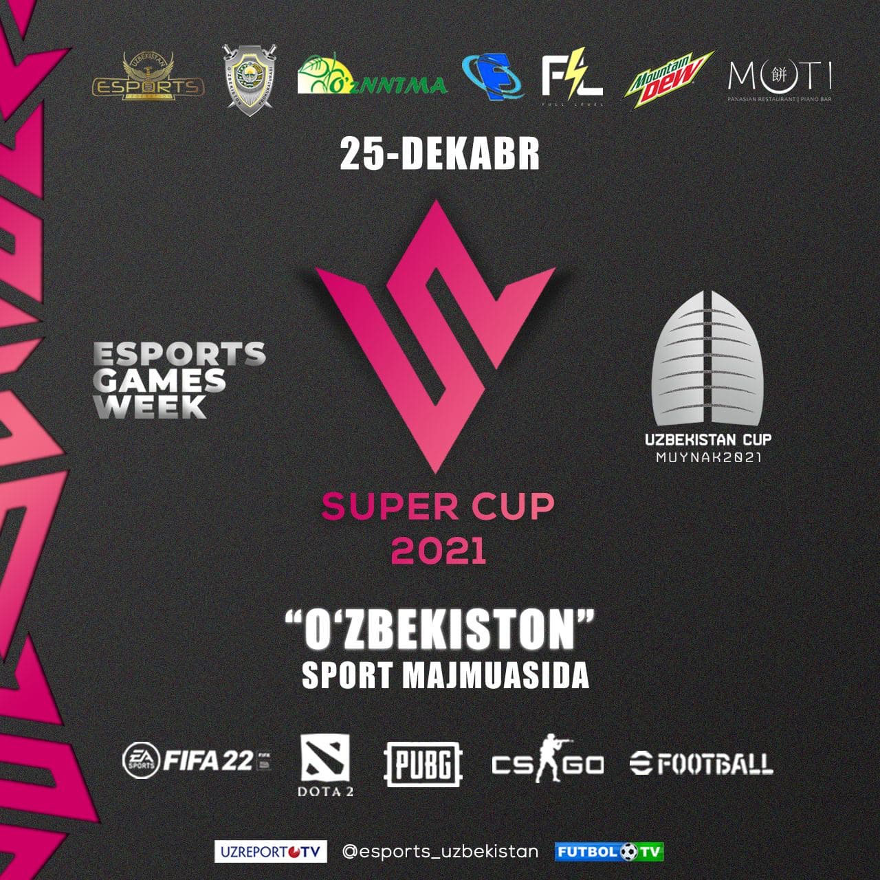Эртага «Юнусобод спорт мажмуаси»да E-sports бўйича “Super Cup-2021” мусобақаси бўлиб ўтади. Унда й...