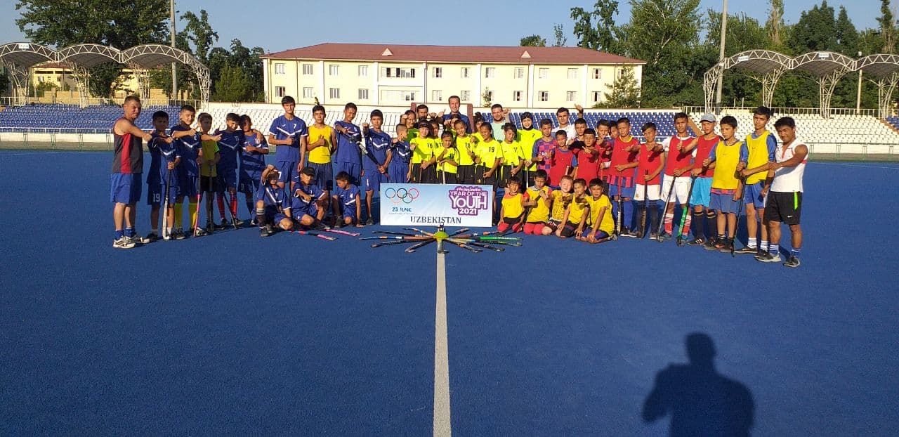 Андижондаги “Халқлар дўстлиги” спорт мажмуасида Халқаро Олимпия кунига бағишлаб чим устида хоккей бў...